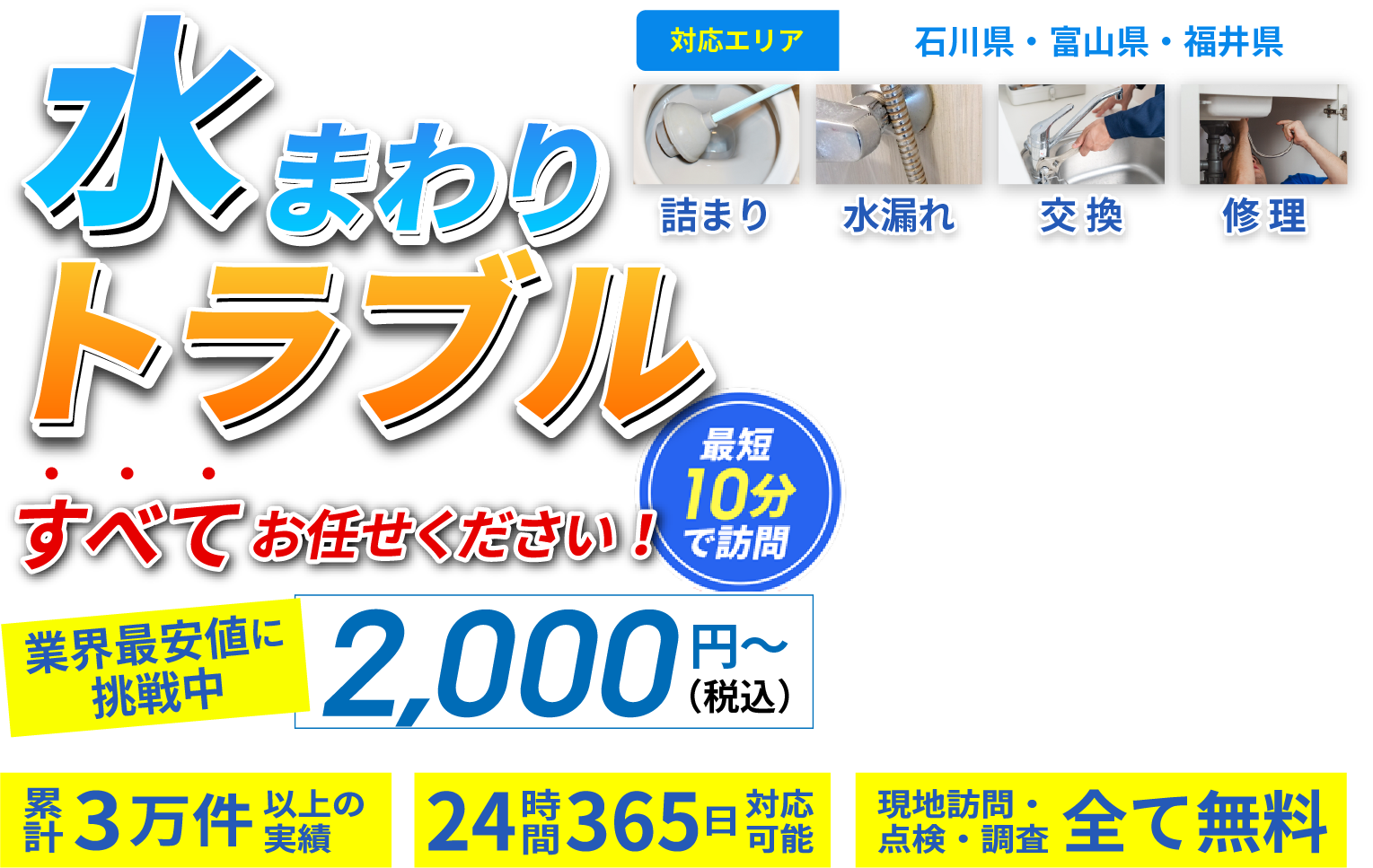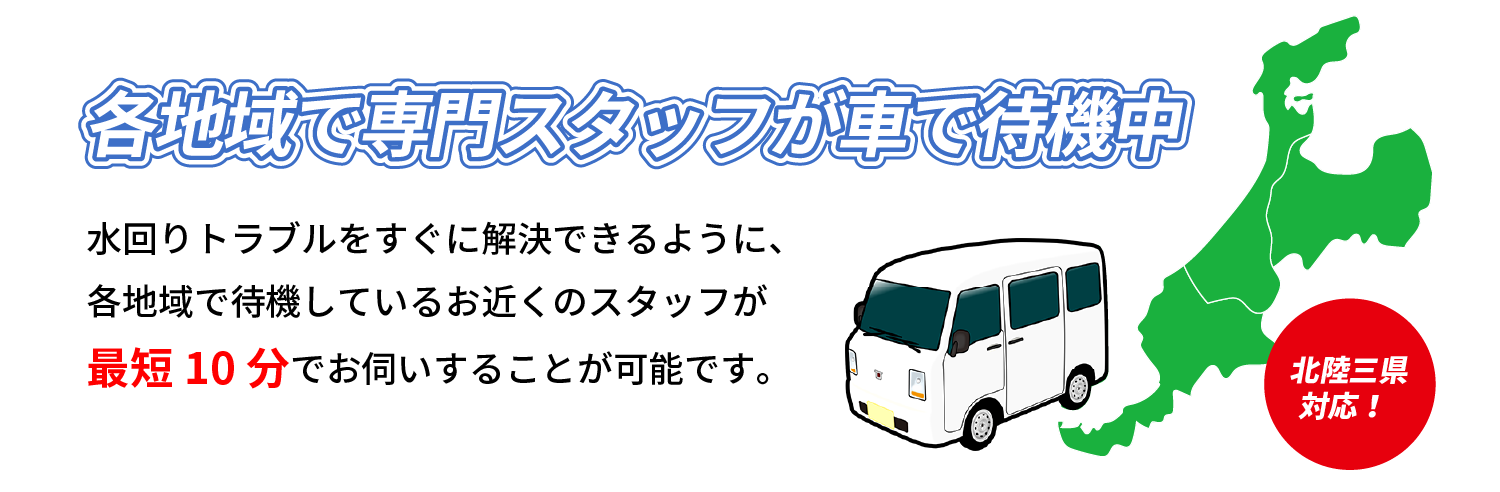 今すぐに修理をご希望の方には、お近くの作業員が最短10分で訪問し対応させていただきます。石川県・富山県・福井県の各エリアに水トラブル解決のプロが直ぐに駆けつけられるように常時待機しております。